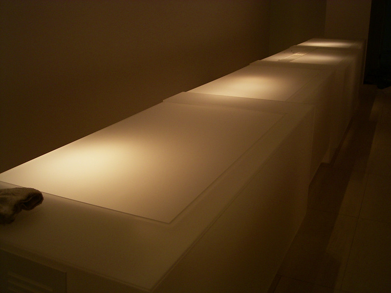 というのもこのカウンター、乳半のアクリル製に見えますが、実は透明アクリルで、その表面がサンドブラスト仕上げになっています。