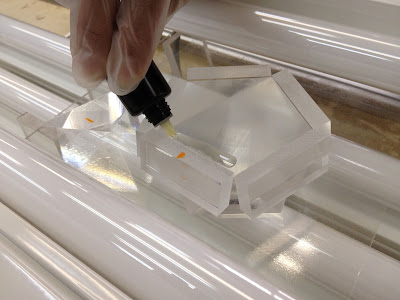 光接着はある特定の周波数の光(紫外線)に反応して固まる透明の樹脂を