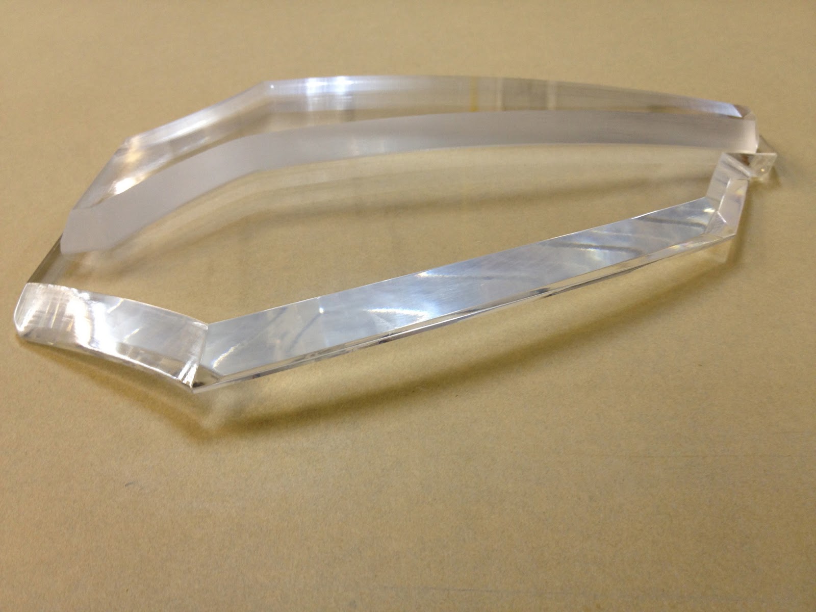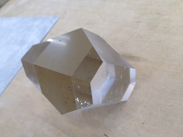 作り方はアクリルのブロックをひたすら削っていくだけなんですが、最初は調子よく削れますが、段々ガイドにできる面が減っていくので、いかに安定して固定できる面を確保するかがキモになります。