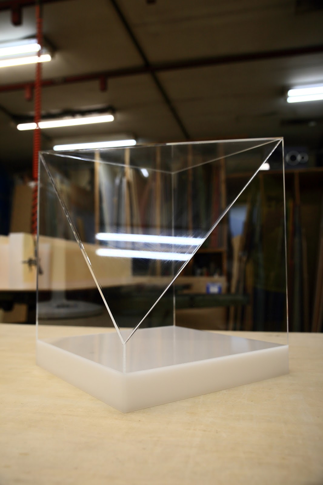 既製品のアクリルパイプをカット、底面と開口にリブを接着、外側のリブはパイプの側面に接着ではなくリブパーツをパイプでサンドイッチしています。