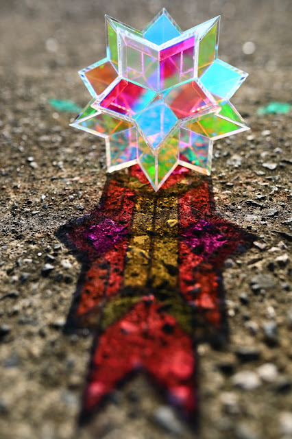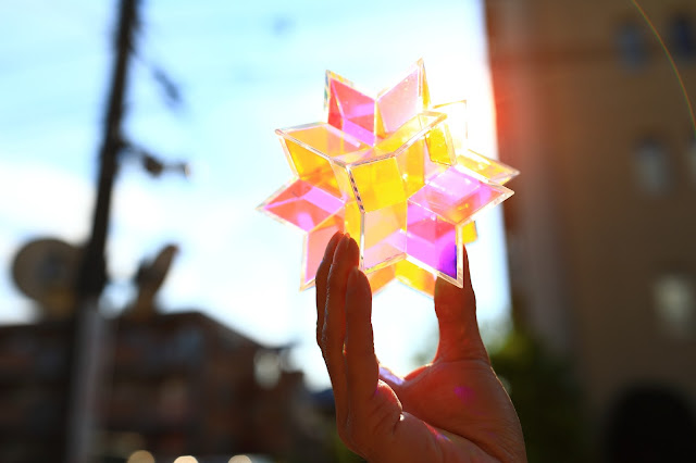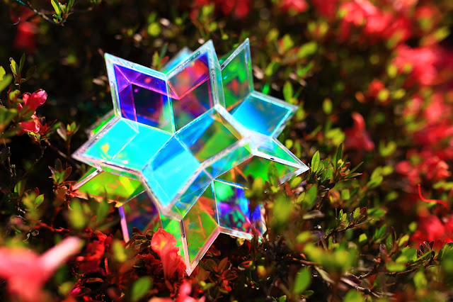 前回作ったワーロン(和紙柄のアクリル)製の菱型六十面体が思いの外つまらなかったので(w)、お仕事で使って余っていた玉虫色のハーフミラーフィルムを貼った透明アクリルで作ってみました!
